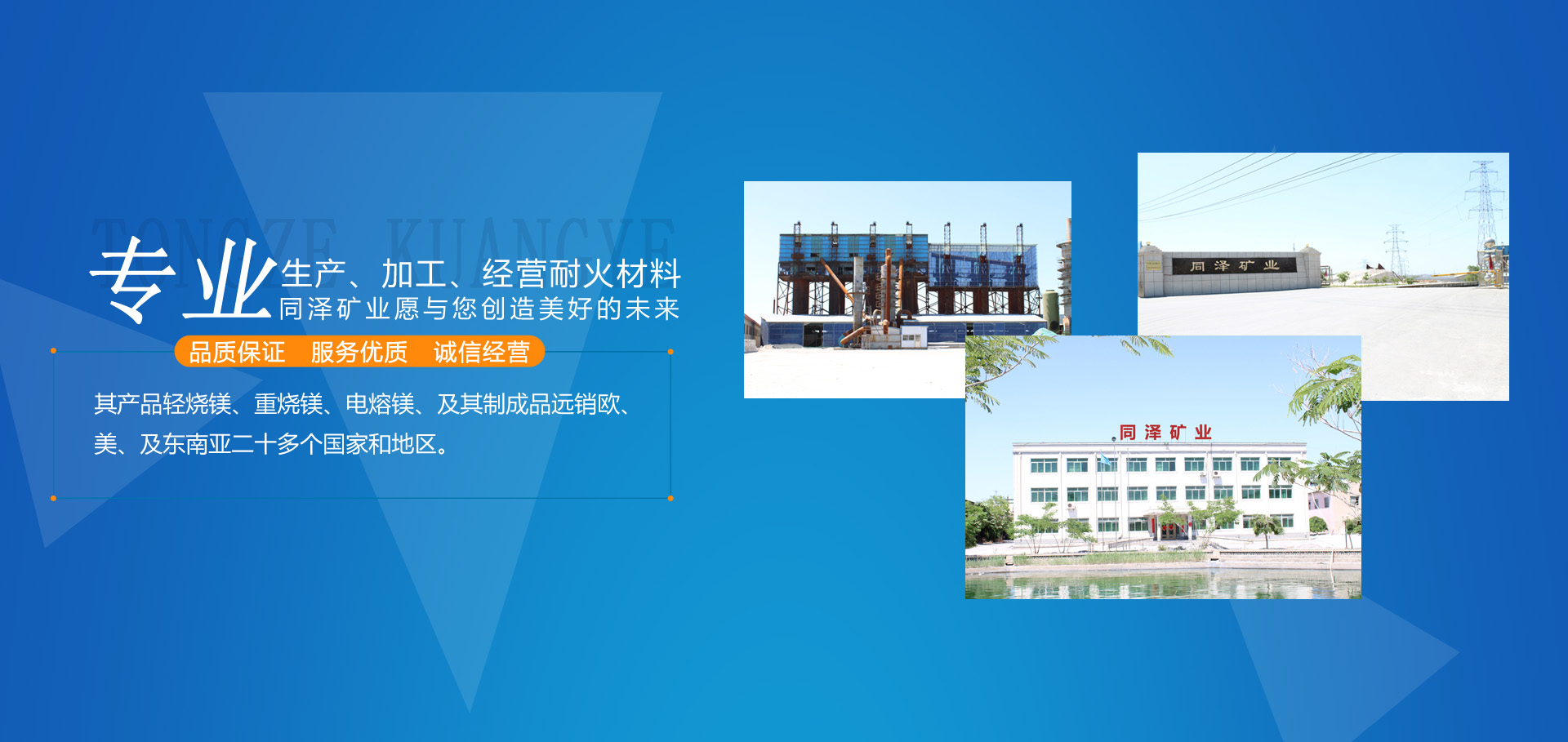 大石橋市同澤礦業有限公司,是以生產、加工、經營各種耐火材料為主的綜合性經濟實體。其產品輕燒鎂、重燒鎂、電熔鎂、及其制成品遠銷歐、美、及東南亞二十多個國家和地區。